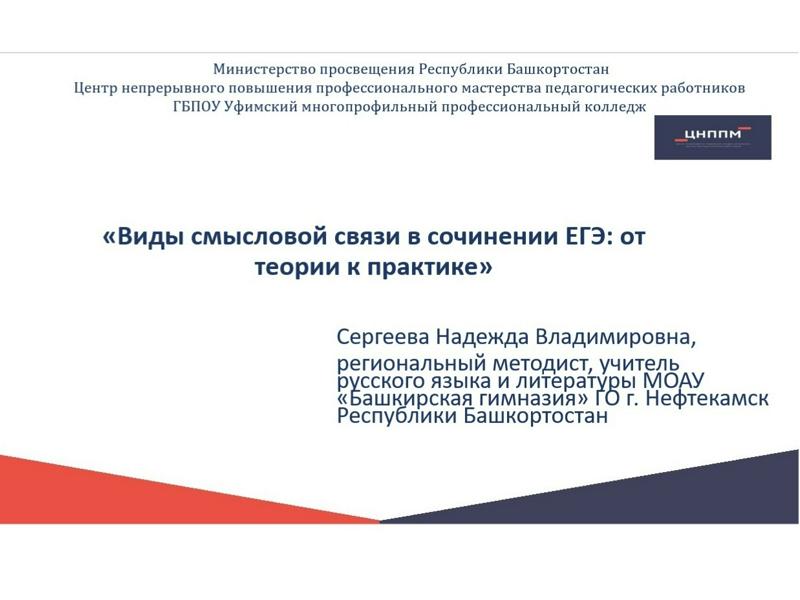 12 февраля на базе Центра непрерывного повышения профессионального мастерства педагогических работников (ЦНППМПР) ГБПОУ УМПК в рамках деятельности регионального методического актива по русскому языку и литературе состоялся вебинар на тему: «Виды смысловой связи в сочинении ЕГЭ: от теории к практике».